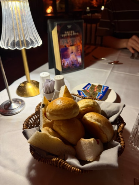 본격적인 식사 전에 식전 빵과 음료가 먼저 제공되는데, 이걸 먹으며 공연을 기다리는 시간이 또 하나의 재미였어요 크 하롱베이여행 코스 중 이렇게 여유로운 분위기 흔치 않거든요
