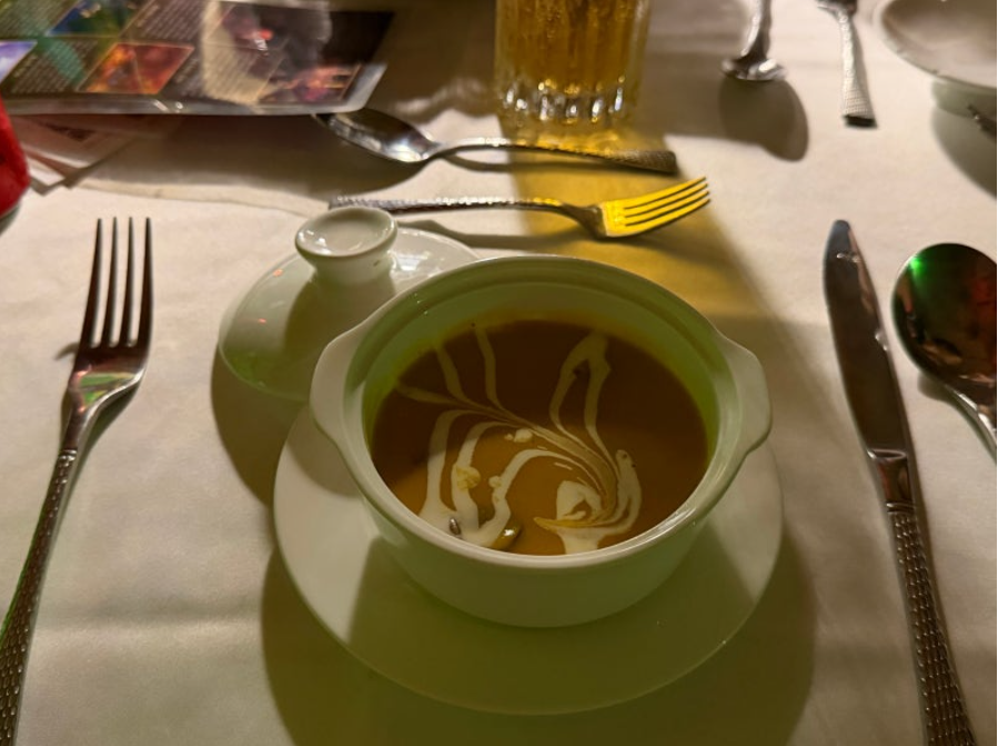코스 구성은 먼저 새우 전채요리로 시작해서 호박 수프가 나오고, 이후 메인 요리가 이어집니다.